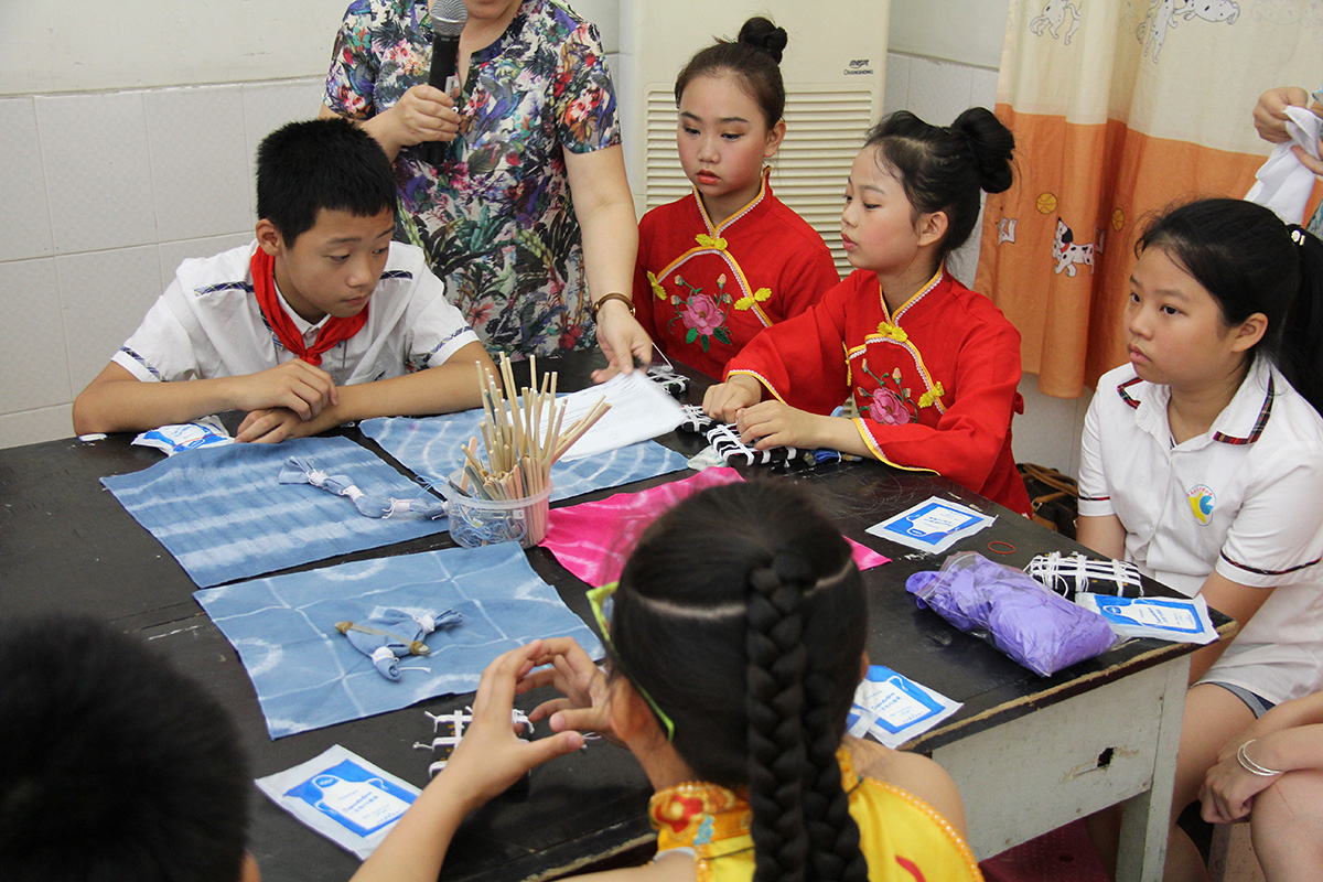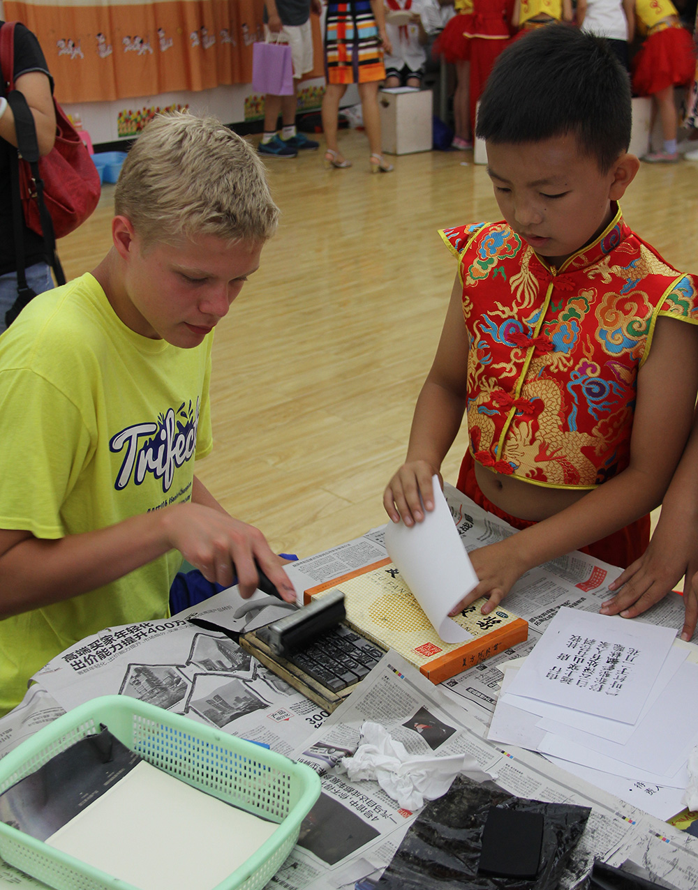 The program started off with some introductions. Then, several of the kids were dressed in traditional Chinese costumes and they performed a dance for us, which was very well done. Next was arts and crafts time. There were 4 activity stations set up around the room with activities representing 4 inventions from the ancient Chinese: paper making, block printing, porcelain painting, and tie die fabric.