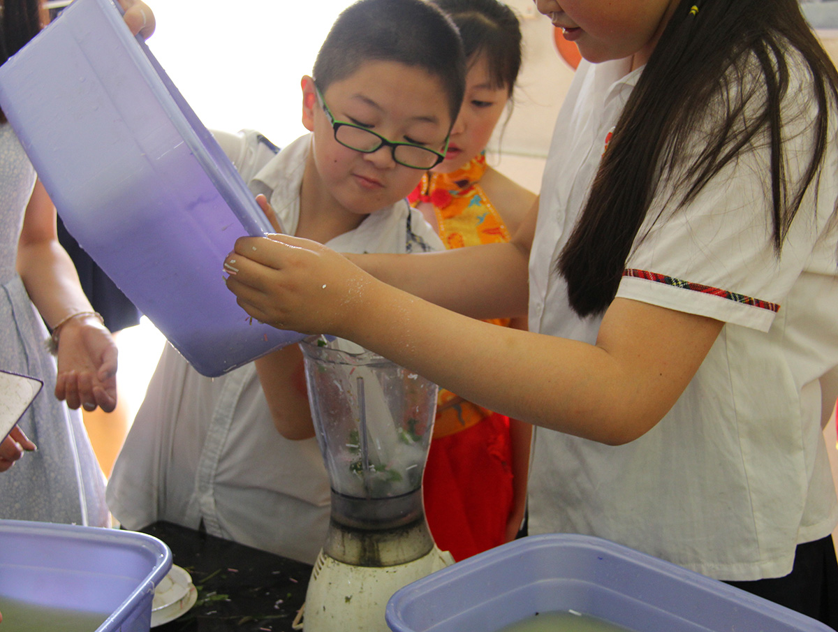 We had a blast as for the next 45 minutes we spent doing the different activities with the kids. As is typical with boys, their interest level waned and they ended up doing other things. A couple of the boys brought out Rubik Cubes and playing with those. One of the boys was really good, so I challenged him to solve it while I timed him. I scrambled it up the best I could, gave it to him, and started my watch. He solved it in just over 50 seconds! One of the stations that got out of control was the paper making station. The process involved putting some paper fiber into a blender with water, blend until dissolved, pour in to tubs, and use a screen to build up the paper. The kids decided they wanted to play “will it blend” and started collecting leaves and berries from the trees to color the paper. Kids with an electric blender is bad enough, but add in large amounts of water being poured back and forth over the blender and spilled on the smooth tile floor, and there’s a recipe for disaster. I saw one kid go down, knocking their head on the stool, but luckily no one was electrocuted. Regardless of the safety hazards, it was a very festive and playful environment and everyone was having a good time.