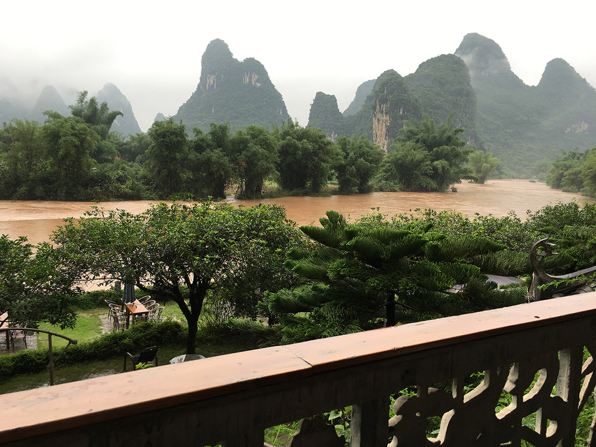 The retreat is owned by an American and run by Chinese who speak English, so it is relatively easy to just relax. The complex has a few small buildings and has a sort of rustic, family feeling. The restaurant has a small bar area with a couple low tables, and then 4 or 5 tables in the main area. It is always open to come sit and relax and there was even a local kitty that would keep us company. Our rooms on the second floor looked over the river and out across several sets of beautiful mountains. These mountains also had a fog shrouding their bases and our first order of business after checking in was to sit on our porch and enjoy a cup of tea, watching the river, and looking out at the mysterious mountains. We spent a lot of the time during this portion of the trip thinking about our dear friend Vanessa, as her memorial service was going on at the same time in Anchorage, and the landscape was fitting of her second home in Hawaii. The second order of business was a massage. Yep, we were in full on vacation mode at this point. 2 ladies came to the retreat from town, came in to our room, and gave us a shoulder, back, and foot massage as we sat and listened to the river rushing by and felt cool air blow over us from the fan in the room. It was wonderful. Chinese foot massage is an art, as they trace many of the nerves to places in the foot. Regardless of whether they’re right or not, it felt great.
