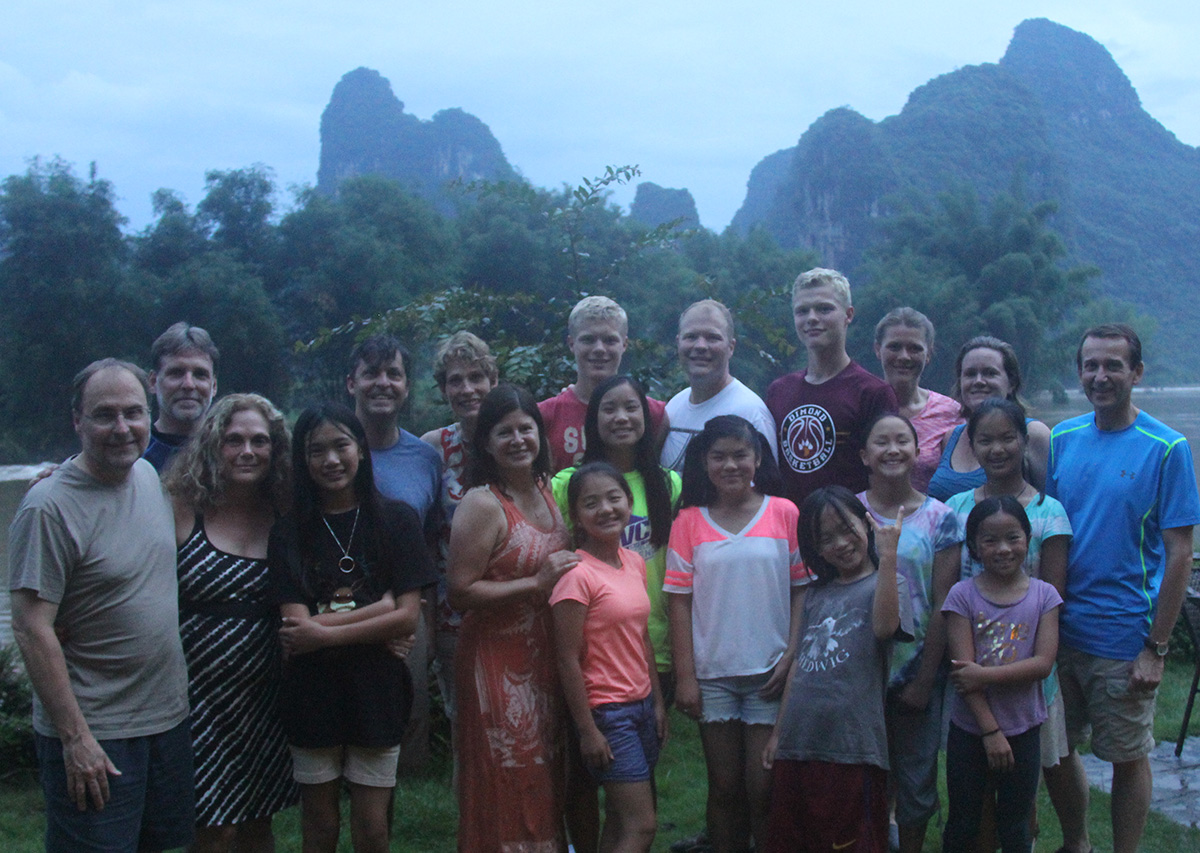 Getting up in the morning and checking out of the hotel, we boarded a bus and headed down to the docks of the Li River, where passenger boats were waiting to take us down river to Yangshuo. This is a small community, maybe 300,000, primarily built around tourism. The geography of the area is spectacular and you have likely seen pictures and images of these mountains. They are known as “finger mountains” and they push sharply up all around the landscape. The area is a sub-tropical climate and so everything is green and lush, reminding me of Hawaii. The mountains are combination of rock sides and dark green foliage and using your imagination, you can see all sorts of pictures in the faces of the hills. The weather was rainy and as we made our way down the river, the mountains had a magical feel, with low clouds swirling all around them and constantly changing what was exposed and not exposed. We spent almost 4 hours cruising down the river, playing games, eating lunch, and drinking beer, enjoying the sites while under the protection of cover.